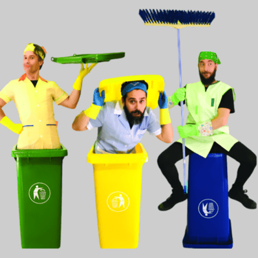 ¡Prepárate para una explosión de diversión y creatividad en nuestro espectáculo infantil! Tres empleados de limpieza muy disparatados tienen la importante tarea de dejar todo perfecto, pero lo que debería ser una simple rutina de ordenar, limpiar y reciclar se transforma en un torbellino de juegos y aventuras.